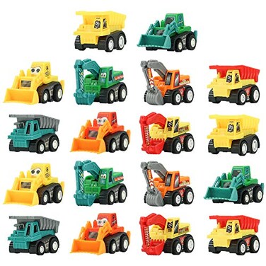 CONSTRUCTION VEHICLE SET: There are two boxes in total and 9 construction vehicles in one box. There has 18 Pcs construction cars.(The color and style of the engineering trucks are DELIVERYED RANDOMLY). | COLORFUL AND REALISTIC DESIGN:These tiny engineering cars are designed based on real engineering vehicles. Recognition of transportation and color discrimination since childhood. | EDUCATIONAL CAR TOYS: Different kinds of construction cars can be satisfy kids for role-playing games which helps them with motor skills, imagination, thinking ability and hand to eye coordination in their early childhood. | BEST GIFT FOR CARS LOVERS: These pull back construction vehicles are the best gift for the kids, they can play a racing game by pulling the toy car back and releasing their hands, which will make children feel challenging. | PARTY DECORARION KIT: Bright and colorful mini cars is the best choice of all kinds of holiday party decorations such as Birthday, Halloween, Christmas stocking stuffers , and party favors. WARNING: CHOKING HAZARD - small parts. Not for children under 3 years old.