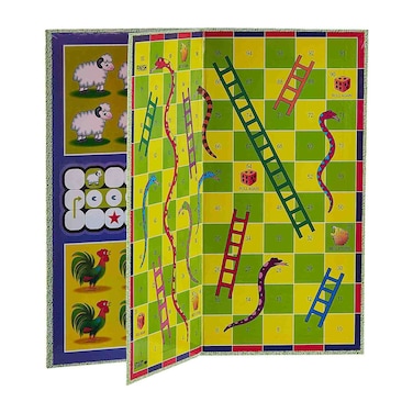 It features a colourful and vibrant design that will capture the attention of players. The game includes a Ludo board with snakes and ladders, as well as dice and playing pieces.