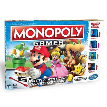 It's the Monopoly board game with a Nintendo twist as it joins forces with beloved Nintendo characters. Instead of standard Monopoly tokens, the Monopoly Gamer edition features Super Mario characters, each with its own unique powers. Buy property, pay rent, and battle for points! The game ends when Bowser has been defeated. The player with the highest score wins!