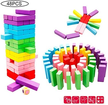 Xinhc, 48 Pcs Wooden Toy Stacking Board Games Tower Building Blocks Colorful Wooden Tumbling Tower Blocks Family Game And Children Educational Toy