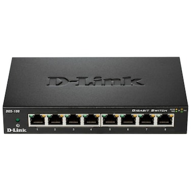 - <p>D-Link DGS-108 metal 8-port 10/100/1000 Switch<p>OVERVIEW<p>The DGS-108 8-Port Gigabit Unmanaged Desktop Switch offers an economical way for SOHO and small and medium businesses to benefit from the increased bandwidth of Gigabit Ethernet. It provides eight Gigabit ports for easy expansion of your network and a quick way to upgrade your network to Gigabit connectivity.<p>SPECIFICATIONS<p>KEY FEATURES<p>Built-in D-Link Green Technology<p>Inexpensive Gigabit solution for Home/SOHO<p>Eight 10/100/1000 Mbps Gigabit ports<p>16 Gbps switching fabric<p>Auto MDI/MDIX crossover for all ports<p>Secure store-and-forward switching scheme<p>Full/half-duplex for Ethernet/Fast Ethernet speeds<p>IEEE 802.3x Flow Control<p>Supports 9, 000 Byte Jumbo Frames<p>Supports IEEE 802.1p QoS (4 Queues, Strict Mode)<p>Supports Cable Diagnostics Function<p>RoHS compliant<p>Plug-and-play installation<p>IGMP Snooping - multicast video/IPTV<p>STANDARDS<p>IEEE 802.3 10BASE-T Ethernet (twistedpair copper)<p>IEEE 802.3u 100BASE-TX Fast Ethernet (twisted-pair copper)<p>IEEE 802.3ab 1000BASE-T Gigabit Ethernet (twisted-pair copper)<p>ANSI/IEEE 802.3 NWay auto-negotiation<p>IEEE 802.3x Flow Control<p>IEEE 802.1p QoS<p>IEEE 802.3az Energy-Efficient Ethernet (EEE)<p>PROTOCOL<p>CSMA/CD<p>DATA TRANSFER RATES<p>Ethernet: 10 Mbps (half duplex), 20 Mbps (full duplex)<p>Fast Ethernet: 100 Mbps (half duplex), 200 Mbps (full duplex)<p>Gigabit Ethernet: 2000 Mbps (full duplex)<p>TOPOLOGY<p>Star<p>NETWORK CABLES<p>10BASE-T: UTP CAT 3, 4, 5/5e (100 m max.), EIA/TIA-586 100-ohm STP (100 m max.)<p>100BASE-TX, 1000BASE-T: UTP CAT 5/5e (100 m max.), EIA/TIA-568 100-ohm STP (100 m max.)<p>MEDIA INTERFACE EXCHANGE<p>Auto MDI/MDIX adjustment for all ports<p>LED INDICATORS<p>Per port: Link/Activity/Speed<p>Per device: Power<p>TRANSMISSION METHOD<p>Store-and-forward<p>MAC ADDRESS TABLE<p>8K<p>MAC ADDRESS LEARNING<p>Automatic update<p>PACKET FILTERING/FORWARDING RATES<p>Ethernet: 14, 880 pps per port<p>Fast Ethernet: 148, 800 pps per port<p>Gigabit Ethernet: 1, 488, 000 pps per port<p>RAM BUFFER<p>128 KB per device<p>DC INPUT<p>External 5 V/1 A Level€œV€ Power Adapter<p>POWER CONSUMPTION<p>Power On (Standby): DC input: 0.55W, AC input: 1.0W<p>Maximum: DC input: 2.8W, AC input: 4.5W<p>HEAT DISSIPATION<p>Power On (Standby): AC input 3.41 BTU/h<p>Maximum: DC input 9, 548 BTU/h<p>MTBF<p>2, 053, 751 hours<p>OPERATING TEMPERATURE<p>0 to 50° C<p>STORAGE TEMPERATURE<p>10 to 70° C<p>OPERATING HUMIDITY<p>10% to 90% RH non-condensing<p>STORAGE HUMIDITY<p>5% to 90% RH non-condensing<p>DEVICE DIMENSIONS (WXDXH)<p>162 x 102 x 28 mm<p>CERTIFICATIONS<p>FCC Class B<p>ICES-003 Class B<p>CE Class B<p>C-Tick Class B<p>VCCI Class B<p>cUL<p>CB</p>