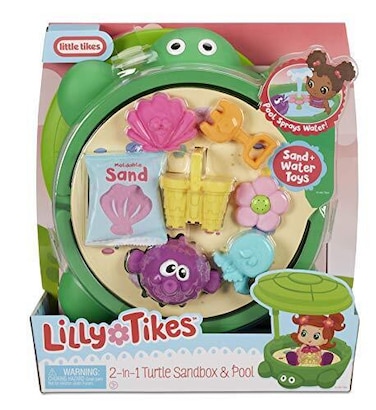 This adorable doll-size playset is perfect for best friends Lilly, Ami & Tommy. Fill the Lilly Tikes 2-in-1 Turtle Sandbox & Pool with real sand for sandbox play, or with water for pool play. And when the pool is filled with water, just press on the yellow starfish to spray water up through the flower. With the easy to assemble, removable sun umbrella, Lilly and her friends always stay cool and happy when they are playing with their fun Sand & Sun accessories. These include: a bucket, shovel, blowfish squirter, two sand molds and three colors of moldable sand to build a sand castle, shell or jelly fish. The lid closes for easy storage, which means wherever your 3+ kids want to play, this great playset travels with you. Here's to imagination in the Sand & Sun.