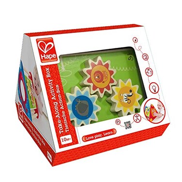 - With so many ways to play, boredom isn't an option. The Take-Along Activity Box from Hape has something for even the pickiest players. This best-selling play set combines bright colours, entertaining activities, and friendly animals in one innovatively designed toy, featuring a friendly owl with winking eyes, moving safari-themed gears, and more. Children can solve a puzzle or search for the end of a maze, and then turn the box around for another fun game while a mirror reflects the joyful smile on their face. Encourages development of coordination, fine motor skills, and problem-solving abilities. Made with wood sourced from environmentally sustainable forests. Durable child-safe paint finish and solid wood construction make this a toy your child will love for years to come. Hape toys stimulate children through very stage of development and help nurture and develop their natural abilities. All Hape products sold in North America meet or exceed all applicable safety standards.