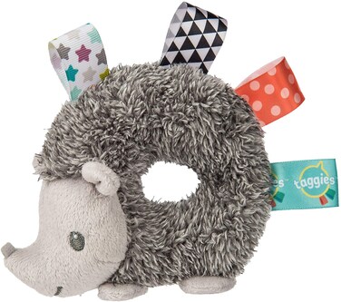 Product Description Heather hedgehog ring rattle gives your baby soft fabric to hold onto, squeeze and shake. Hedgehog rattle has a sweet embroidered face, soft for little ones, and is adorned with interactive and soothing satin loop tags that babies love to explore. Taggies was born over a decade ago when a mom noticed her child's fascination with satin tags. This idea blossomed into a world of treasured products. Exploring Taggies textured tags can provide tactile stimulation that babies crave for development and have an amazing calming effect on little ones. Taggies signature collection is recognized as the premium line of wonderfully soft and soothing Taggies toys made by Mary Meyer.