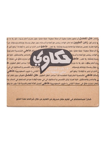 - <li>A set of 150 cards suitable for family gathering, these set of open ended questions might take you back with your memory to the past or perhaps add some laughter through the what if and would you rather questions<li>Hakawi is a storytelling game that will engage family and friends to cultivate true conversation and connection</br></br>A set of 150 cards suitable for family gathering, these set of open ended questions might take you back with your memory to the past or perhaps add some laughter through the what if and would you rather questionsHakawi is a storytelling game that will engage family and friends to cultivate true conversation and connection</br></br>Specifications</br></br>|Department : Unisex|Product Height: 12 cm|Product Length: 16 cm|Product Weight: 510 g|Product Width/Depth: 5 cm|Target Age Range: 10+ Years