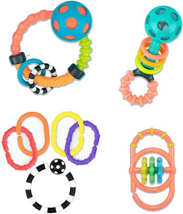 The perfect gift for new baby. Soft, squishy structure is perfect for baby's environment and different materials and surfaces are easy to grasp and great for mouthing. Flexible parts providing the perfect manipulation challenge for little hands and contrasting colors stimulate baby's developing vision and awaken auditory awareness. The set includes the peek-a-boo beads rattle, ring O' Links, ring rattle, and linky links