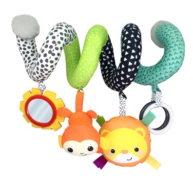 This soft activity spiral features 4 unique toys that rattle, crinkle and swing. Wraps around car seat handles and most strollers. Encourages reaching, grabbing and batting while keeping your little one engaged and interested.