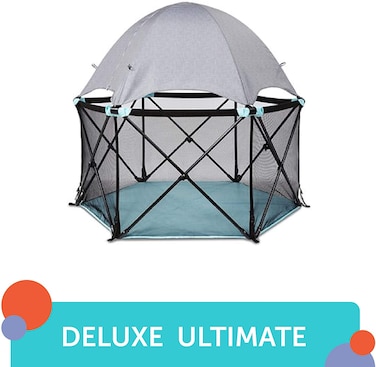 - Description: The pop 'n play deluxe playard by Summer Infant allows you to easily create a safe, portable play area for your little one. This lightweight and compact playard can be set up and taken down in seconds, making it perfect for use at home or on the go, inside or outside. Features include a clip on full-coverage canopy, padded floor, and touchscreen enabled entrainment pouch. A travel bag with shoulder strap is included for added convenience. Features: Freestanding and portable with padded floor for comfort and protection, 14 Square -Feet Playing area (48-Inch wide, 26-Inch tall). Lightweight folding frame comes fully assembled, full coverage canopy blocks 98-Percent of harmful UVA/UVB rays. Two zip open panels for easy access and optimal air flow with mesh sides for easy visibility. Fashionable aqua splash with textured gray canopy includes travel bag with shoulder strap for easy portability. Overview: Product Dimensions: 21.6 x 21.6 x 98.6 cm Weight: 5.44KG Shipping Weight: 5.44KG Recommended Age: Suitable for 6 - 24 months