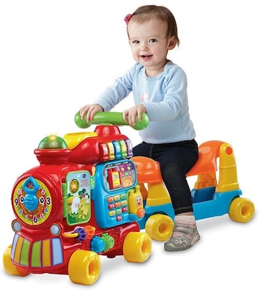 4-in-1 train, cart and activity panel takes kids from floor play to walker to ride-on to pull cart Removeable activity panel enhances floor play with 10 learning buttons that teach numbers, colors and locations; on-the-go panel encourages role-play driving.16 activities include 13 double-sided interactive alphabet blocks, travel book, turning gear and popping beads.Block play: insert into port to hear about letters and objects; drop down the counting chute; build on cart; tumble down the pegged seat panel.Intended for ages 12-36 months
