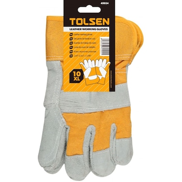 <li><b>Tolsen Working GLove made of cow split leather.<li>Made of durable, durable, durable synthetic leather.<li>Sturdy, meticulous seam line.<li>Contribute to safety during work.<li>Black cow split leather palm rest.<li>SPECIFICATIONS<li>Item Name Leather Working Gloves<li>Model 45024<li>Brand Tolsen<li>Material Polyester<li>Colour Yellow and Grey<li>Size 10<li>Brand Origin (not manufacture) China<li>Packing Quantity 1<li>Unit Pair