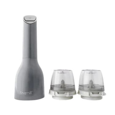 • The best way to grind spices of all shapes and sizes! Mill whole spices, from petite poppy seeds to plus-size peppercorns Operates with just one hand at the push of a button Swappable grinding pods keep flavors distinct Wide-mouth opening for easy spice refills Built to last with durable ceramic grinding mechanism Sleek, minimalist design looks great on your kitchen counter and dining room table Made with 100% BPA-free plastic How to use: Simply fill a grinding pod with your favorite spice and attach it to the FinaMill. Hold the FinaMill over your food, press the button, and a LED light will illuminate a shower of freshly ground spices. You can operate the FinaMill with just one hand—perfect for multitasking cooks and people with limited mobility. FinaMill grinding pods double as storage for all your spices, and can be swapped in with just a couple clicks. Even the grind size is adjustable; mill dried chiles to a fine grind or coarsely crack black pepper and sea salt. Requires 3 AA batteries, not included