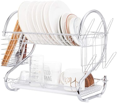 2 TIER DEISGN & SAVING SPACE: 16.5 inch big size S-shaped 2 tier dish drying rack and double drain design, the 2 tier dish rack provides more space, reasonable storage of your dishes, cups and a variety of table ware.HIGH QUALITY MATERIAL: Crafted of heavy duty high-graded chrome plated iron and comes, more strong endurance, surface using polishing treatment, smooth surface. And all materials and processes are in line with international environmental standards, let your cutlery and fork cups safely placed.SUFFICIENT CAPACITY: Top tier of the dish rack places up to 11 pcs plates, down tier places up to 18 pcs bowls, both sides are designed for cups and utensils organization, meeting the family's basic needs.REMOVABLE DRAINING BOARD: Allows easy removal of excess water, effectively prevent the upper and lower tableware drain cross-contamination, keeps countertop clean and dry.Easy Setup and Installation: Comes with all hardware for mounting and set up, follow the instructions included to assemble the dish rack. Compact enough to fit on your counter top while large enough to hold all your dishes.Product Description: Dish Drying Rack Drain while you're storing The bottom drain pan, collect excess water from the dishes, keep the table clean. Quality Construction Powerfully crafted with an attractive chrome finish, the dish rack is resistant to rust. Safe and Steady Anti-Slip and silicone coated feet protectors to keep the drying rack steady.