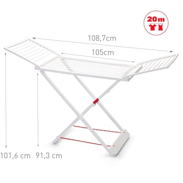 Dimensions - 55 x 180 x 108cm This Plastic Forte clothes drying rack has dimensions of 55 x 180 x 108cm. It is made of high quality plastic. It holds up to 20 meters of fabric. It has a lock system for safety. Made in Spain