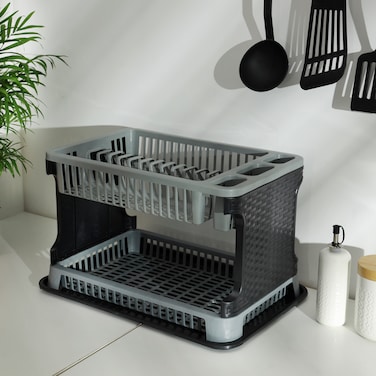 Royalford 2 layer rattan dish drainer Organizer with TrayThis dish basket is much enough for holding large amount of kitchen utilities.Made of high-quality unbreakable ABS plastic material. You can place the washed utensils in the Royalford Plastic Dish Drainer & Rack, as the presence of a well-designed surface at the bottom enables quick water drainage from washed utensils. The dish drainer and rack are easy to clean, helps to keep your kitchen clutter-free and well-equipped. Wide spaces between dishes allow for fast air-drying. Inside the dish basket dedicated slots are present to fix plates and bowls perfectly without mess. This dish basket is much enough for holding a large amount of kitchen utilities. In hollow design, there is a diversion tray at the bottom which is easy to drain and there is a special small drain place to place chopsticks and spoons, the chopsticks and dishes placed separately which is very convenient.