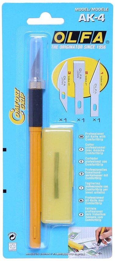 - <p>Brand: Olfa<p>Model Number: AK-4<p>Type: Cutting<p>Color: Multi Color<p>Product Features: Brand: Olfa Model Number: AK-4 Type: Cutting Color: Multi ColorColor Details: Yellow and BlackMaterial: PlasticProduct Width: 18 mmProduct Length : 100 mm