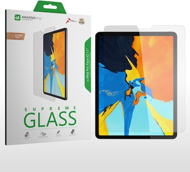 AMAZINGthing Supreme Glass EXTRA HARD Tempered Glass Screen Protector for the Apple iPad PRO 11 inch (2018) Face ID features 2.5D rounded edges for a safe and comfortable precise fit. The Supreme Glass has an Oleophobic coating which prevents fingerprints and contaminants making the glass protector easy to clean. With only 0.3mm thickness and rounded edges, the Supreme Glass is a Ultra Thin Glass protector which maintains the original screeen Touch Sensitivity and perfect HD clarity.