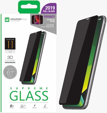 - <p><em>Extra Strong with Privacy..... the best of both worlds !</em></p> <p>AMAZINGthing Supreme Glass PRIVACY EX BULLET 3D Fully Covered Screen Protector for the Apple iPhone 11 keeps your information confidential by shielding visibility from people around you while also having a 3X stronger reinforced border offering maximum protection against chipping to the edges of the protector (which is the most vulnerable part of a glass protector). The PRIVACY EX BULLET has undergone and passed 150cm Drop Tests. It is only 0.3mm thick and covers the Maximum possible area of screen with a color matched border to replicate original look of phone bezel.<p/> <p>Enjoy downtime without worrying about prying eyes looking at your screen. While you can see the screen clearly, people around you see a Blank screen.</p> <p>The Protector allows you to install most covers as long as the case / cover is not touching / pushing up the protector edges. IF using a cover on your phone, it is recommended to install the Ex Bullet Glass Protector while the cover is already installed on the phone.</p>