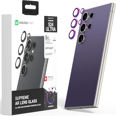 Amazing Thing Supreme AR LENS defender for Samsung Galaxy S24 ULTRA is a Camera Lens Protector with Tempered Glass featuring AR Ultra Clear Technology coating to not only protect your valuable investment but also ensure uncompromising clarity and no interference to flash. The AR lens defender incorporates an Aluminum Alloy ring to ensure a stylish and classy look while Anti-Dust Omni Technology offers dust free protection. The AR Lens Defender is Waterproof, Scratch resistant and designed to be case compatible so you can use your favorite cases while keeping your camera lenses scratch free.