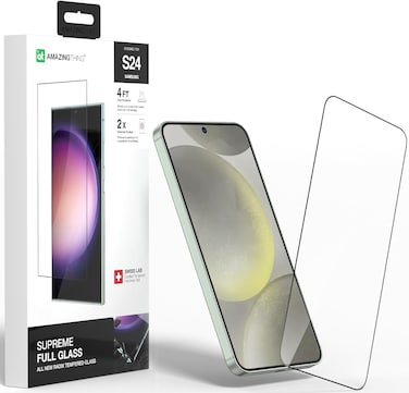 AMAZING THING RADIX Supreme Glass Full Glass for Samsung Galaxy S24 is a strong 9H hardness rated Tempered Glass screen protector which covers almost the entire screen with a color matched border to replicate the original look of iPhone bezel. The protector has Rounded edges for a Safe, comfortable fit & an Oleophobic coating to prevent contaminants making the glass easy to clean. Touch screen sensitivity is maintained like the original screen. Just make sure the case / cover is not touching / pushing up the protector edges