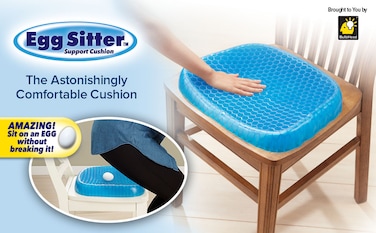 - Sitting for long periods of time puts pressure on your tailbone and hips. Alleviate your achy spine and backside on the Egg Sitter, the support cushion that supports so well that you can sit on an egg without breaking it. Say goodbye to sore, stiff muscles caused by sitting all day or long car rides. Standard support cushions need a hole cut out of the cushion to support your tailbone. Egg Sitter flexes and conforms to your tailbone and shape, absorbing pressure points. Unique Flex-Grip Honeycomb Design Egg Sitter jumps ahead of the curve with its unique flex-grip honeycomb design. When you sit on Egg Sitter, it collapses in on itself to provide you with optimal lumbar support and comfort. Made with ultra-flex polymer, Egg Sitter cradles your tailbone. The honeycomb grid allows air to circulate through the cushion so it stays cool to the touch.