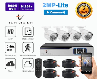 Tomvision - 4Channel AHD Camera KIT 2Megapixels/720P CCTV Security Recording System CCTV Kit 4Pcs Outdoor Bullet Camera and P2P Cloud Alarm System Home Security (4Channel(No HDD), 4Outdoor)