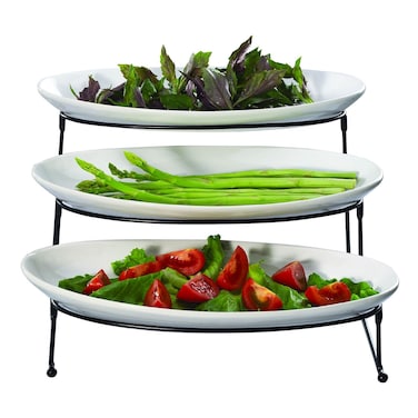 The set includes three oval-shaped ceramic dishes that are perfect for serving a variety of dishes, from appetizers to desserts. The dishes are arranged on a sturdy metal stand, which not only adds a touch of elegance but also makes it easy to serve and display your food.
