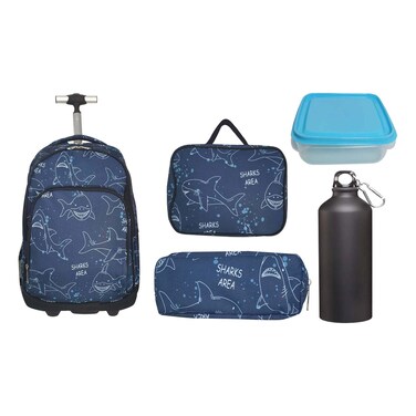 The Shark Happy Shark Area Themed Trolley Backpack Laptop Bag Pencil Case Water Bottle Set is a multi-coloured set that is perfect for shark enthusiasts.