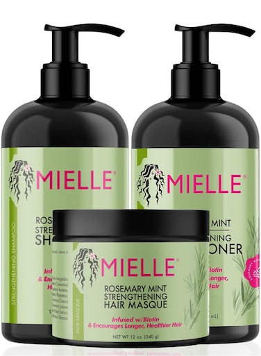 Mielle Organics Rosemary Mint Strengthening Trio Set - Shampoo, Conditioner, Hair Mask - Infused With Biotin, Cleanses And Helps Strengthen Weak And Brittle Hair 1050ml
