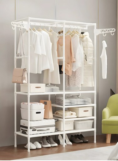 2-Tier Garment Rack Shelf Organizer with 2-Floor Hanger & Hooks Multifunctional Clothing Wardrobe and Shoe Storage Organizer Freestanding Coat Iron stand (White)