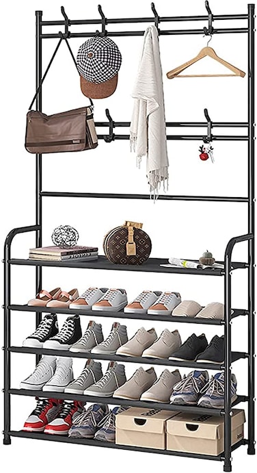 Perfectly combined with coat rack、storage shelf and shoes bench for your daily storage needs. The top rod provides space to hang your clothes, and the 5 extra shelves can be used to store your shoes, handbags, boxes or more accessories, which would save much space for your home and keep the entryway neat and tidy.