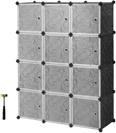 - <p><li>DIY WARDROBE: This 12-cube Plastic Wardrobe can be assembLED into different style to meet your various needs of organization, fit rooms from entryway, closet, mudroom or bedroom and enjoy the fun of DIY<p><li>MULTI-USE CUBE ORGANIZER: Each cube size 13 3/4”L x 13 3/4”W x 13 3/4”H (35 x 35 x 35 cm), this Plastic Storage Cabinet not only can hold folding clothes, fabric drawers, bags, but also can hold books, CDS, yarns and toys<p><li>ECO-FRIENDLY MATERIAL: Constructed from ABS connector, PP plastic panel, this Cube Organizer will be Eco-friendly and harmless to both you and your pet, Rust-proof iron frame made the panel easy to maintain<p><li>STRONG STORAGE ABILITY: With 10lbs load-bearing for each cube, this closet can hold clothes from spring to winter to meet your long-term storage needs, dust-proof PP Plastic Doors with metal ring design for easily opening and closing.