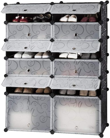 Jj-Boutique Diy Shoe Rack, Storage Drawer Unit Multi Use Modular Organizer Plastic Cabinet With Doors, Black And White Curly Pattern (12 Cubes)