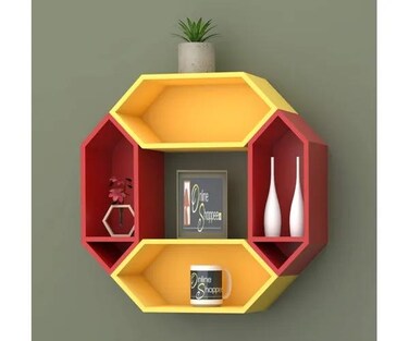 Wooden Pared Hexagon Floating Wall Shelf with 4 Shelves