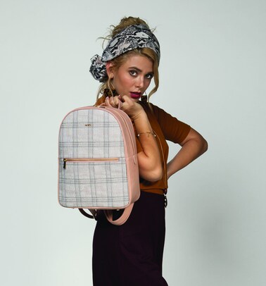 Amica Eva Plaid Black Backpack has been crafted from vegan leather. Featuring a classic zip-closure backpack with top handle, adjustable straps and front zippered pocket with plaid detail throughout.