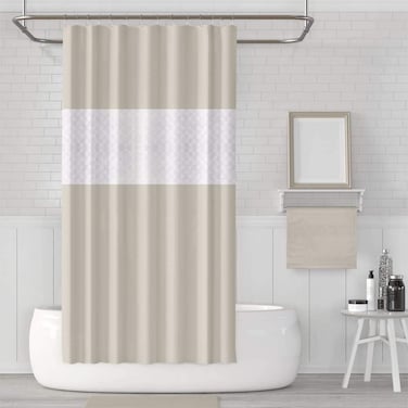 - DIMENSIONS: 72-inch width by 78-inch length. PATTERN: Beige design with Light-Filtering Mesh Window at head levels to let light into your shower, while still providing the privacy you desire. FUNCTION: Waterproof - water glides off and dries quickly. INCLUDES: 1 shower curtain and 1 set of plastic shower curtain rings, the rod is not included
