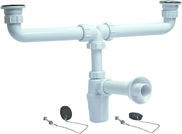 Drain connection Bottle strap for double kitchen bowl sink. Plastic components. Package includes: White bottle trap waste water hose connection, valve top made of stainless steel, valve plug with chain and chain holder