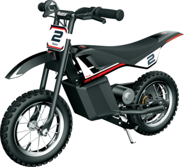 <li></b> The MX125 is Razor’s smallest electric dirt bike, scaled down to size for riders ages 7 and up<li>Designed with motocross dirt bike geometry, knobby tires and twist-grip throttle<li>Rear-wheel drive delivers better balance control and traction for a safer, more stable ride<li>Carries riders at speeds of up to 8 mph (13 km/h) with up to 40 minutes of continuous use<li>Features a crossbar reinforced handlebar, spoked wheels with 12” pneumatic, knobby tires, retractable kickstand, and hand-operated rear brake<li>Includes a 12V sealed lead-acid rechargeable battery<li><li><li><li><h2>Specifications</h2><li><li>Speed: Up to 8 mph (13 km/h)<li>Run Time: Up to 40 minutes of continuous use<li>Motor: 100 watt, high-torque, chain-driven, rear-wheel drive<li>Throttle: Twist-grip<li>Brake: Hand-operated, rear<li>Frame: Steel with authentic dirt bike geometry<li>Fork/Handlebars: Steel<li>Fairings: Shatter-resistant, plastic<li>Grips: Foam<li>Wheels: Spoked with 12” pneumatic, knobby tires<li>Kickstand: Retractable<li>Foot Pegs: Folding, metal<li>Battery: 12V sealed lead-acid, rechargeable<li>Includes: Battery charger<li>Age: 7+<li>Max Rider Weight: 110 lb (54 kg)<li>Some Assembly Required<li>Assembled Product Dimensions: 36.42” (925mm) L x 21.46” (545 mm) W x 25.16” (639 mm) H<li>