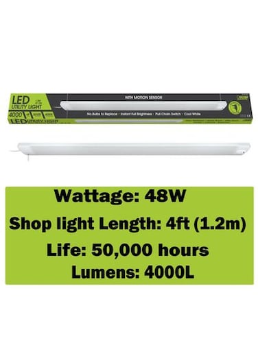 - The Feit 4ft (1.2m) Slim LED Shop Light requires no lamps to replace and lasts up to 50,000 hours or 46 years (based on normal household use of 3 hours per day). The PIR motion detection allows for intuitive use, turning on when motion is detected and off when there is no activity. Alternatively you can use the pull out chain or switch to quickly turn the light on and off. It's perfect for garages, basements, game rooms, utility rooms, workshops and lofts. Features an easy plug-in fixture, nice and quiet with no humming, instantly turns on with full brightness and displays a sleek modern design.