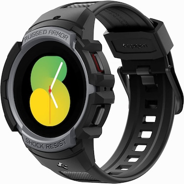 Spigen Rugged Armor Pro Case with Band designed for Samsung Galaxy Watch 5 - (44mm) and Galaxy Watch 4 (44mm) with extra durability and an unforgettable look. It comes in a uni-body frame that includes an adjustable band with a protective cover for the watch. Made of a flexible yet durable material, the case handles all unwanted impact while staying extremely easy to put on and remove. Its matte-finished body and Carbon Fiber accents add a modern look. Rugged Armor Pro bears all Watch compatibility in mind working with the Galaxy Watch 5 / 4 (44mm).