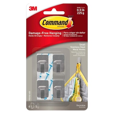 Command 17031SS-4ES Stainless steel metal hooks, small, Silver color. 4 hooks and 5 strips/pack