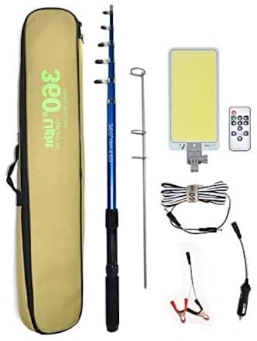 - Package content : 4.5M fishing rod + rod stand + 5M wire + cigarette lighter + battery clips +adjustable bracket + remote control + 76cm handbag. Multi-mode: brightness, 100%, 50%, 25%. Multi stroboscopic mode, SOS mode. Super bright: 800W 2400LM. Low power consumption yet with high level of brightness. Power Source :This led light can be directly connected to the car battery, in-car power and 12V battery. The panel won't get dangerous hot which benefits from the excellent heat dissipation in order to protect our customer from scald. IP68 waterproof, 12 month international seller warranty and lifetime support.