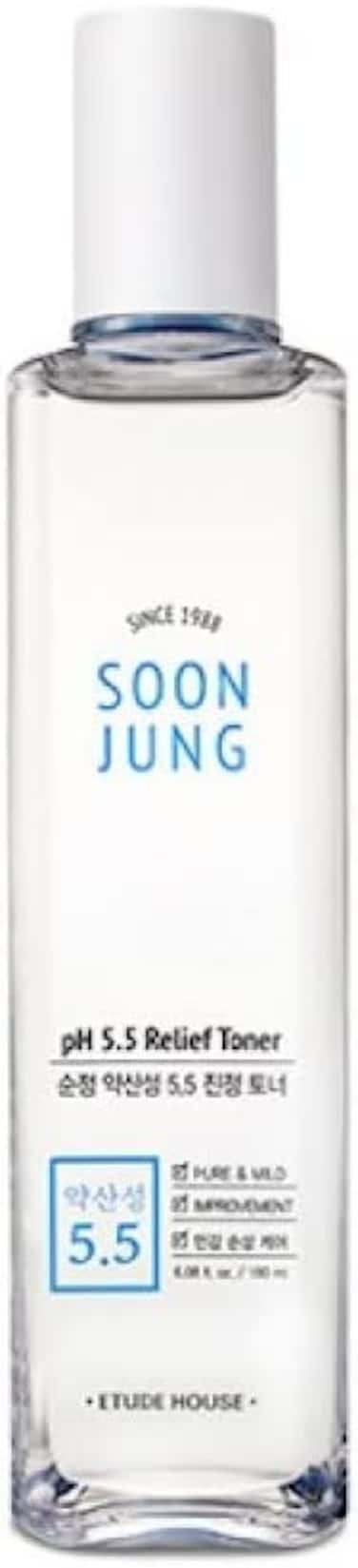 Etude House Soon Jung pH 5.5 Relief Toner soothes heated skin caused by external stimulation. Skin-soothing Panthenol and Madecassoside are contained to calm down irritated skin. Panthenol strengthens the skin barrier and helps maintain moisture, which is effective in soothing skin irritation caused by dryness. Madecassoside calms down the irritated skin and helps protect the skin from exterior stimulations. Formulated at an ideal pH level that is similar to the pH of healthy skin, helps the skin become balanced and healthier. Quantity: 200 ml.
