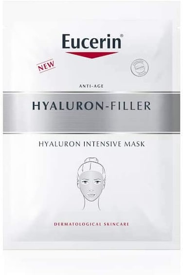 Eucerin Hyaluron-Filler Hyaluron Intensive Mask for all skin types is an anti-aging face mask for immediate hydration. Fine lines are reduced and skin looks and feels dewy, fresher, more radiant and rejuvenated. In just 5 minutes this innovative face mask moisturizes skin and reduces fine lines. Hyaluron Intensive Mask is infused with Eucerins blend of high and low molecular Hyaluronic Acid. High molecular Hyaluronic Acid improves hydration and smooths fine lines in the outermost layers of skin while low molecular Hyaluronic Acid, which is 40 times smaller1, penetrates further into the epidermal skin layers where deeper wrinkles originate. The mask itself is made of biocellulose, a biodegradable material of natural origin thats easy to apply, fits perfectly to facial contours without slipping and feels as comfortable as a second skin. Clinically and dermatologically proven to deliver excellent results, this moisturising and anti-aging face mask cools skin as it works, reducing fine lines and leaving skin looking and feeling dewy, fresher, radiant and rejuvenated.