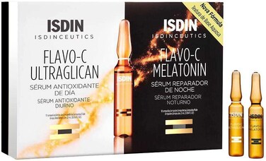 Isdin Isdinceutics Day And Night Pack, Flavo-C Ultraglican (10 Ampoules) And Flavo-C Melatonin (10 Ampoules), Daily Antioxidant Serum And Night Recovery Serum