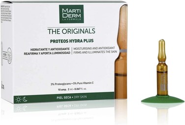 MARTIDERM beauty products are designed to take care of yourself, pamper you and feel beautiful every day of the year.Moisturising and firming formula with proteoglycans and Vitamin C that brightens the skin and helps reduce wrinkles. Proteos Hydra Plus ampoules start working from the first application, moisturising and brightening the skin, leaving it more supple. Daily use prevents and corrects wrinkles, and firms the skin.