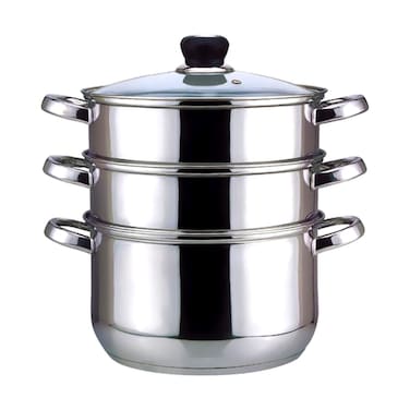 - This three-level steamer comes with a glass cover and is ideal for steam cooking vegetables and fish