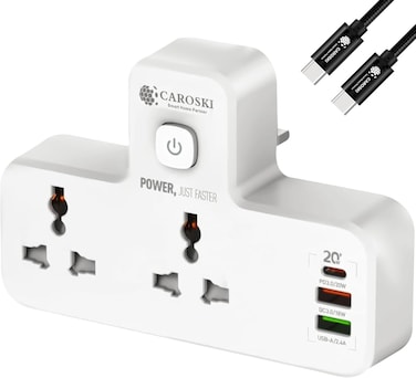 CAROSKI 3-in-1 Power Extension Socket Multi plug Adapter - 20W USB-C PD Quick Charge Port - 2 USB-A QC3.0 - 2 Universal Outlets Extension Plug - UK 3-Pin plug with light for Home - Office - Kitchen