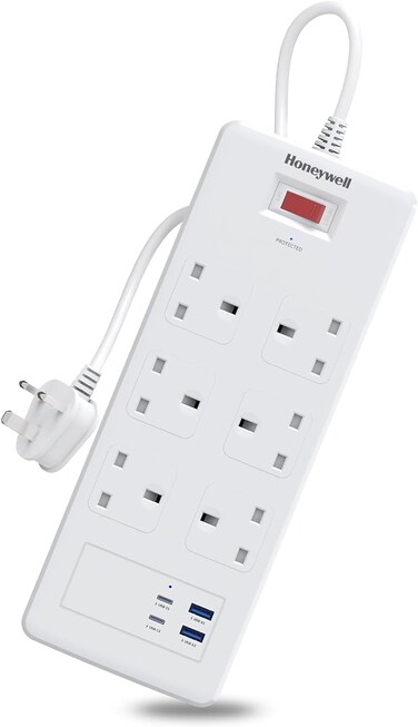 Honeywell 6 Out Surge Protector with Master Switch, Spike Guard/Extension board, 6 Outlet, 2xPD20W & 2xUSB,1050 Joules,1.8 Meter Cord, DSW, Automatic Overload Protection, 3 Years Manufacturer Warranty