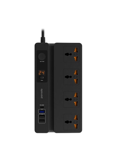 Porodo Multi-Function Socket With Phone Stand And Digital Timer 3M, Three USB-A Output Ports Fire-Proof Material Power Strip, 3000 Watts AC Output, Power Button & 24Hr Timer - Black