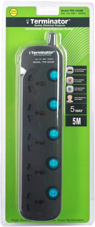 - Terminator 5 Way Universal Power Extension Socket 3X1.25Mm2 Black Body & Blue Switch 5M Cable 13A Plug